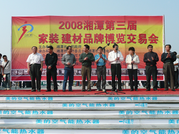 2008年10月17日上午,湘潭市第三届家装建材品牌博览交易会暨长株潭两型社会家装建材产品主题展示会在湘潭市白石广场隆重开幕。本届博览会为期4天,总共吸引了上百家全国知名的业内精英企业加盟参展,展会现场盛况空前。此次展会首先由家博会组委会秘书长、湘潭市经济委员会副主任李顺生致开幕词,随后,湖南省室内装饰协会常务副会长兼秘书长姚保林发表重要讲话。湘潭市室内装饰行业协会副会长、知音装饰公司董事长何闯以及中意彬华建材超市董事长唐文兵则先后代表参展装饰企业与参展建材商进行发言。最后,在一阵阵龙狮锣鼓声中,湘潭市人大常委会副主任王少庚宣布本届家博会隆重开幕。到会参与仪式的各界领导以及嘉宾还有:湘潭市经济委员会主任陈准;湘潭市广播电视局局长熊兴保;湘潭市广播电视局党委书记王映玲;湘潭市质量技术监督局副局长刘力平;湘潭市广播电视局副局长李运启;湘潭市室内装饰行业协会会长刘谋怀;湘潭市室内装饰行业协会名誉会长黄如道等。 湘潭市第三届家装建材品牌博览交易会的成功举办,是政府、协会共同努力的结果,更是湘潭市整个装饰行业蓬勃发展的见证。