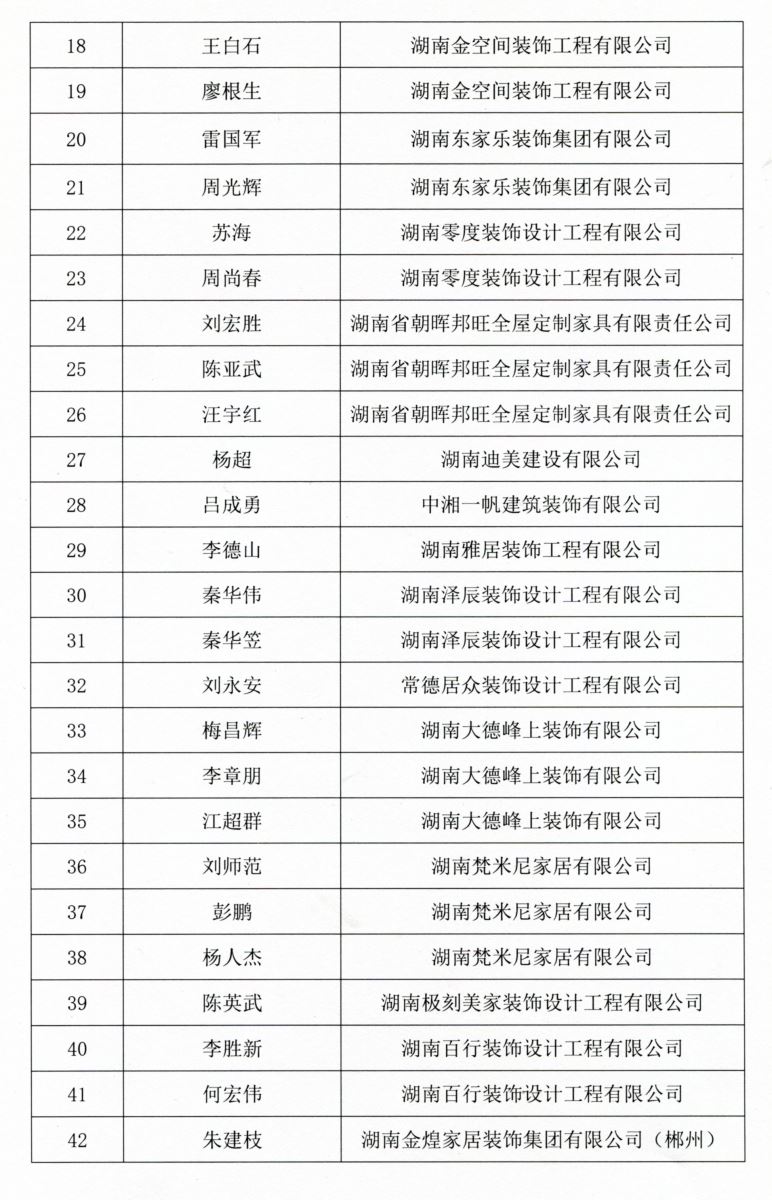 中国室内设计卓越成就奖(15人): 长沙艺筑装饰设计工程有限公司:王湘苏、刘炼 湖南鸿扬家庭装饰设计工程有限公司:陈志斌、瞿铁奇; 湖南美迪建筑装饰设计工程有限公司:赵益平、杨凯 湖南自在天装饰设计工程有限公司:汪晖、黄海华 湖南随意居装饰设计工程有限公司:夏林霞、伍向阳 湖南点石装饰设计工程有限公司:阙祚虎、徐亚琼 长沙市金煌建筑装饰有限公司:杨丽霞、孙香; 长沙市双成室内设计有限公司:桂双成