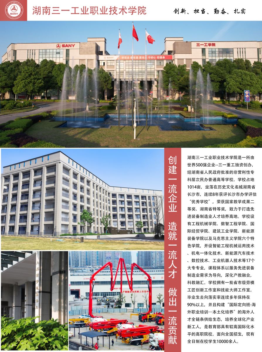 湖南三一工业职业技术学院是一所由世界500强企业--三一重工独资创办,经湖南省人民政府批准的非营利性专科层次民办普通高等学校。学校占地1014亩,坐落在历史文化名城湖南省长沙市,连续8年获评长沙市办学评估“优秀学校”,荣获国家教学成果二等奖、湖南省特等奖,致力于打造先进装备制造业人才培养高地。学校设有工程机械学院、数智工程学院、国际经贸学院、建筑工业学院、新能源装备学院以及马克思主义学院六个特色学院,开设智能工程机械运用技术、机电一体化技术、新能源汽车技术、数控技术、工业机器人技术等17个大专专业,课程体系以服务先进装备制造业需求为导向,深化产教融合,科教融汇。学校拥有一批省市级劳模工匠创新工作室和技能大师工作室。毕业生去向落实率连续多年保持在90%以上,并且构建“国际定向班-海外职业培训—本土化培养”的海外人才全链条供给生态,培养全球化产业新工人,是教育部具有较高国际化水平的高职院校。面向全国招生,现有全日制在校学生10000余人。 办学特色明显。学校秉承“先做人,后做事,品质改变世界”的三一文化,践行“创新、担当、勤奋、扎实”之校训,实施质量立校、人才强校战略,以产教融合为特色,为社会输送了大量特色鲜明,下得去、干得好、留得住的高级技术技能型工匠人才,面向国家先进装备制造业和工程机械产业重点培养“灯塔工厂”技术师和工程机械“医生”。经过十多年的办学,学校已形成了校企合作共建、国际化、订单培养、海外实训基地等多元化、个性化的学历教育和培训教育的办学格局。 师资力量雄厚。学校现有教职工637人,其中专任教师525人,占比82.42%,“双师型”专业课专任教师 333 人,占专业课专任教师 443 人比例为75.17%。研究生以上学位专任教师 300 人,其中博士 10 人;研究生及以上学位教师比例 57.14%。专任教师中,副高及以上职称人才 112 人,占比 21.33%。另聘有三一集团企业导师和校内专职兼课教授118人,兼职教师占比22.48%。 拥有1个院士工作站,1个工程机械产业学院联盟,3个省市级技能大师工作室;建有3个国家级生产性产教融合基地,104个校内实验实训基地、154个校外实习实训基地;学校是国家现代学徒制试点单位、教育部“1+X”证书制度试点单位、全国工程机械人才培养基地、全国智能制造人才培养基地、全国住宅工业化人才培养基地。 办学成果丰硕。2022年,我校主持完成的《“三三制”培养灯塔工厂技术师的研究与实践》等4个教学成果荣获国家教学成果奖二等奖、湖南省教学成果特等奖、一等奖等奖励。 专业优势突出。学校设有5个二级学院,拥有工程机械智能制造专业群、工程机械技术服务专业群、工程装备新能源应用技术专业群、工程施工智能建造技术专业群、工程机械数字商贸专业群等5个专业群,17个高职专业、五个中职专业对接湖南主导产业、支柱产业,其中“机电一体化”为国家级骨干专业,“智能工程机械运用技术专业群”为省级高水平专业群。 古韵潇湘,梨江之滨,三一学府,月异日新。今天的湖南三一工业职业技术学院面临前所未有的历史机遇,三一人将继承和发扬“创建一流企业、造就一流人才、做出一流贡献”的文化传统,大胆变革创新,打造核心竞争力,落实扩大办学规模、提升办学层次、加快内涵建设规划目标任务。为实现面向未来最有价值教育品牌的三一梦奋勇前行,为实现中华民族伟大复兴的中国梦而努力奋斗!