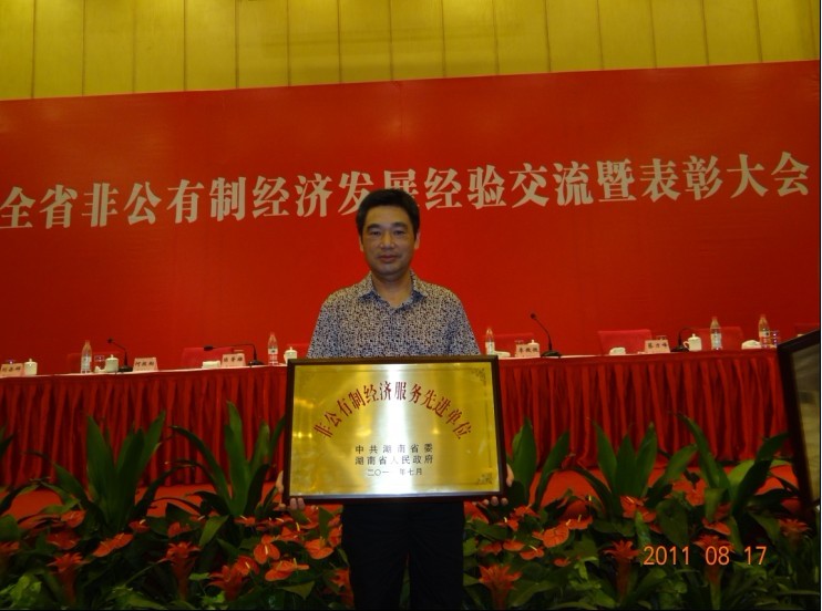2011年8月17日上午,长沙市芙蓉华天大酒店二楼华天厅灯火辉煌,全省发展非公有制经济经验交流暨表彰大会在此隆重举行。出席这次表彰大会的省领导有省委副书记梅克保,省委常委、省委统战部部长李微微,省委常委、长株潭试验区工委书记陈肇雄,省人大常委会副主任蔡力峰,省政协副主席、省工商联主席何报翔。在主席台就坐的还有省委副秘书长龚文密、省政府办公厅副主任刘岳辉同,省委统战部副部长、省工商联党组书记崔永平,省经信委主任、党组书记谢超英。湖南省室内装饰协会会长姚保林、常务副会长兼秘书长李金龙和全省各地获奖代表出席了本次表彰大会。会议由省委常委、省委统战部部长李微微主持,省委常委、长株潭试验区工委书记陈肇雄作了《转变发展方式,加快结构调整,促进全省非公有制经济科学发展》的工作报告,省政协副主席、省工商联主席何报翔宣读了中共湖南省委、湖南省人民政府《关于表彰发展非公有制经济先进单位和先进个人的决定》,湖南省室内装饰协会和全省其他19个单位被评为“湖南省非公有制经济服务先进单位”,并颁发了铜牌。会议在听取四个单位的代表经验介绍后,梅克保副书记最后发表了重要讲话。他要求各级各部门一是要深化认识,切实增强加快发展非公经济的责任感和紧迫感;二是要把握重点,加快推进非公经济发展方式的转变;三是要综合施策,着力化解当前非公经济发展困难。